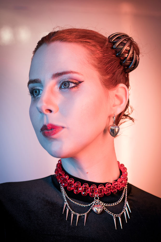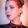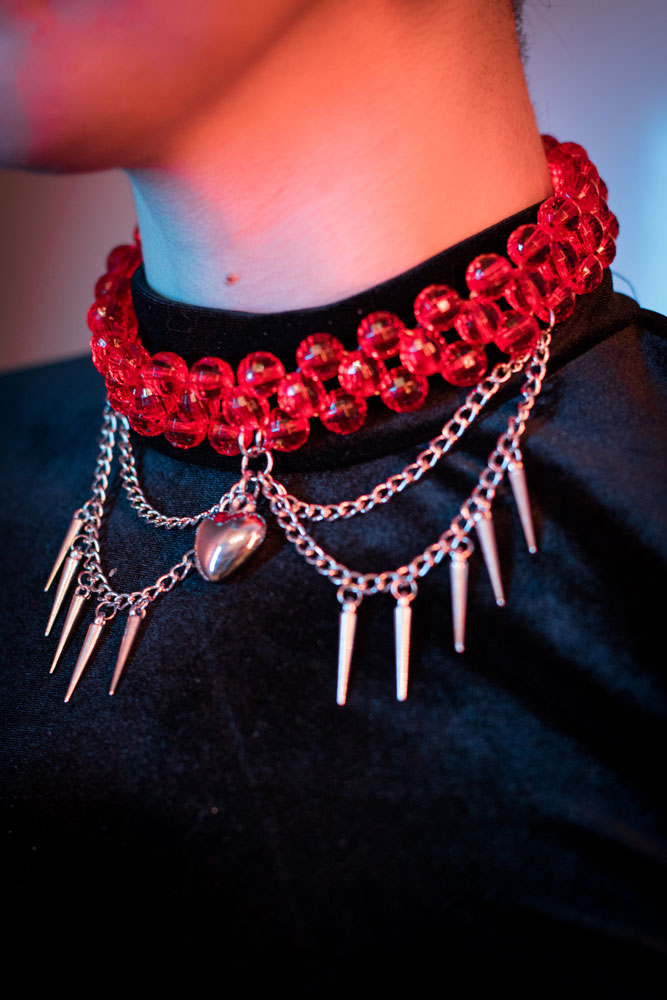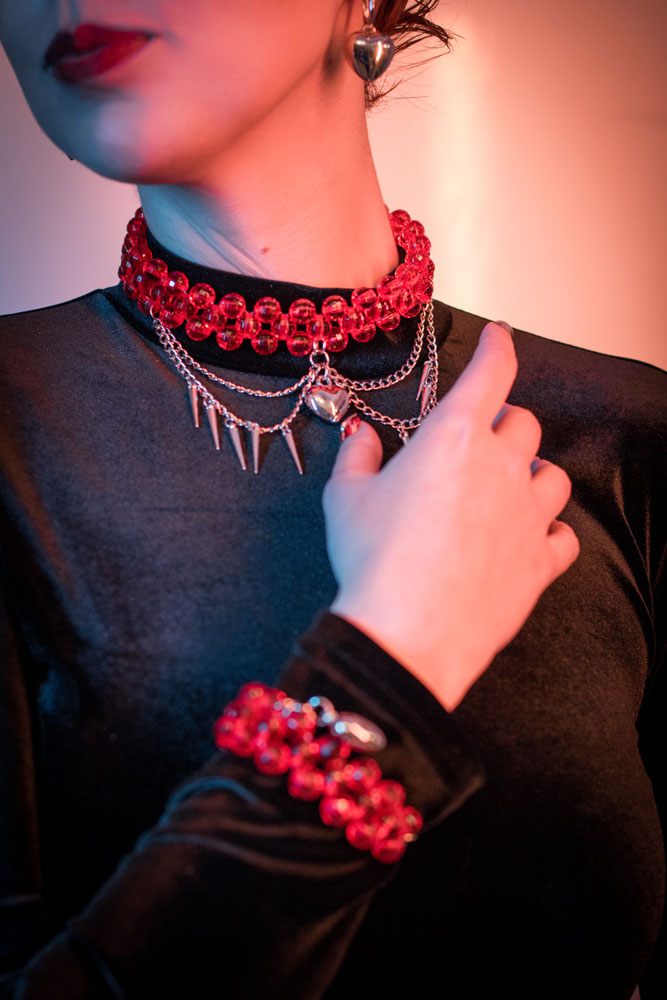- A choker made of red acrylic beads with metal chains and a plastic heart charm.