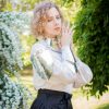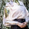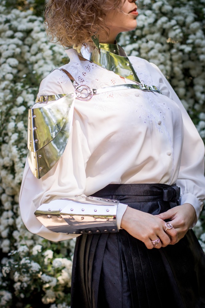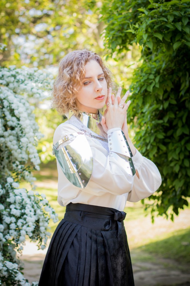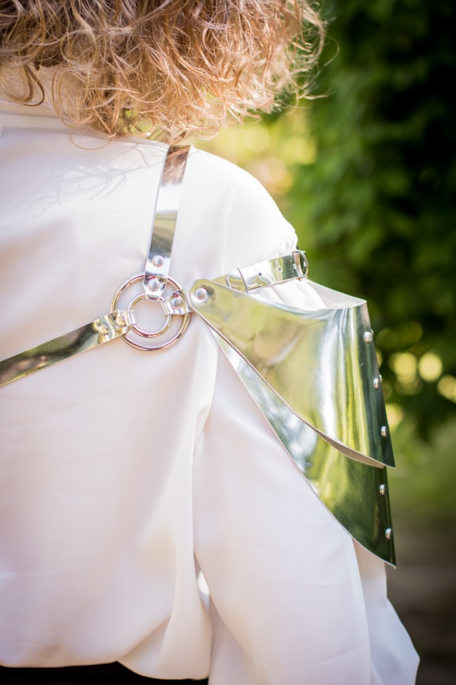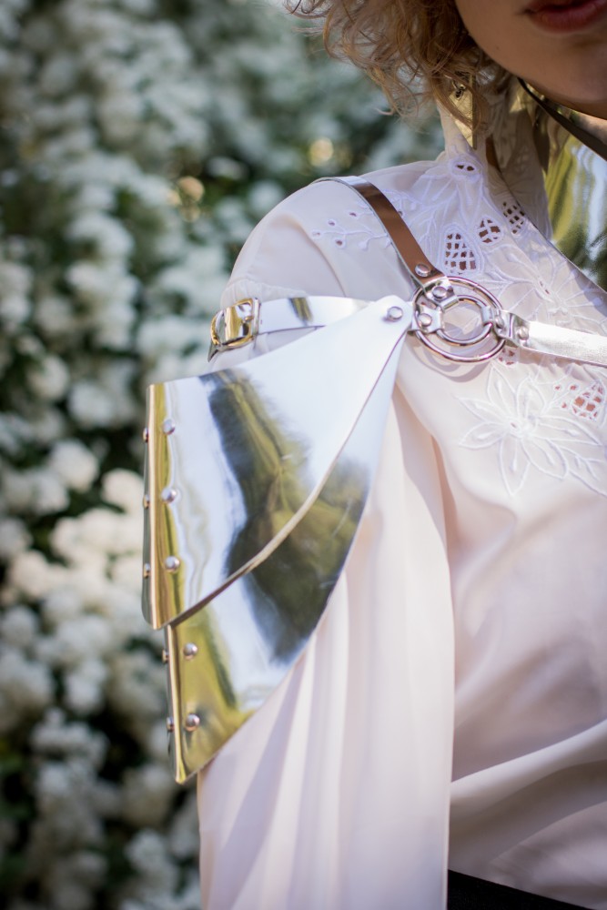 - A pauldron made of leather with a metallic effect.